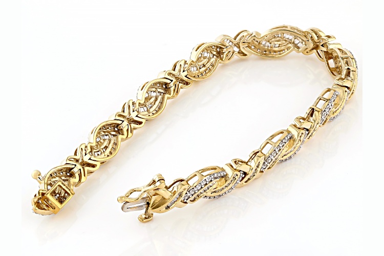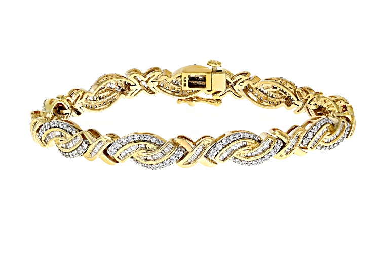 Bella Luce® white diamond simulant 4.80ctw baguette and round, 18k yellow gold over brass tennis bracelet. Measures approximately 7.25-8" L x 0.36" W and has a hidden box clasp closure. The diamond equivalent weight is 2.90ctw.