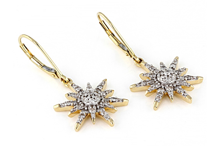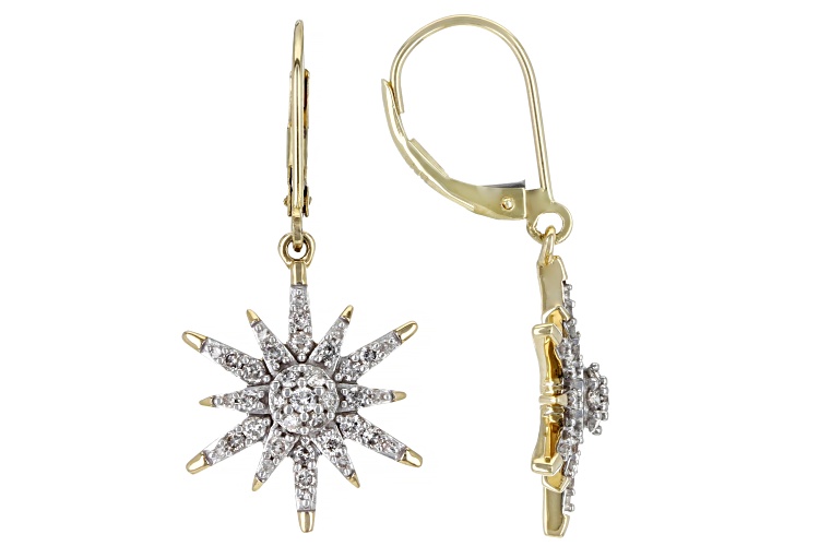 Park Avenue Collection® 0.80ctw round white diamond, 14k yellow gold celestial dangle earrings. Measure approximately 1 & 3/8"L x 9/16"W and have lever back backings. White rhodium enhanced settings.