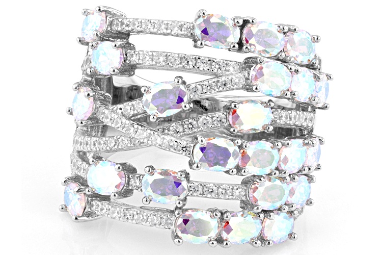 Pre-Owned Bella Luce® 6.12ctw Oval Aurora Borealis And Round White Diamond Simulant Rhodium Over Sterling Silver Ring. Measures approximately 0.92"L x 0.80"W and is not sizeable. The diamond equivalent weight is 3.71ctw.. This product may be a customer return, vendor sample, or on-air display and is not in its originally manufactured condition. It may not be new. In some instances, these items are repackaged by JTV.